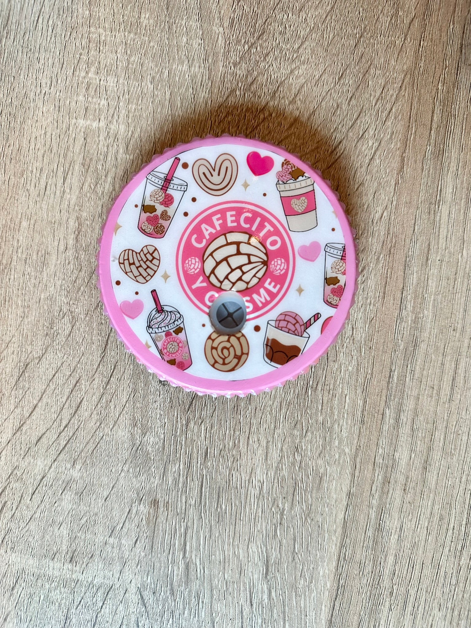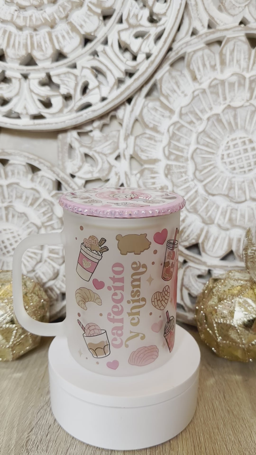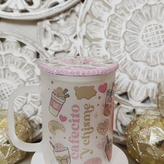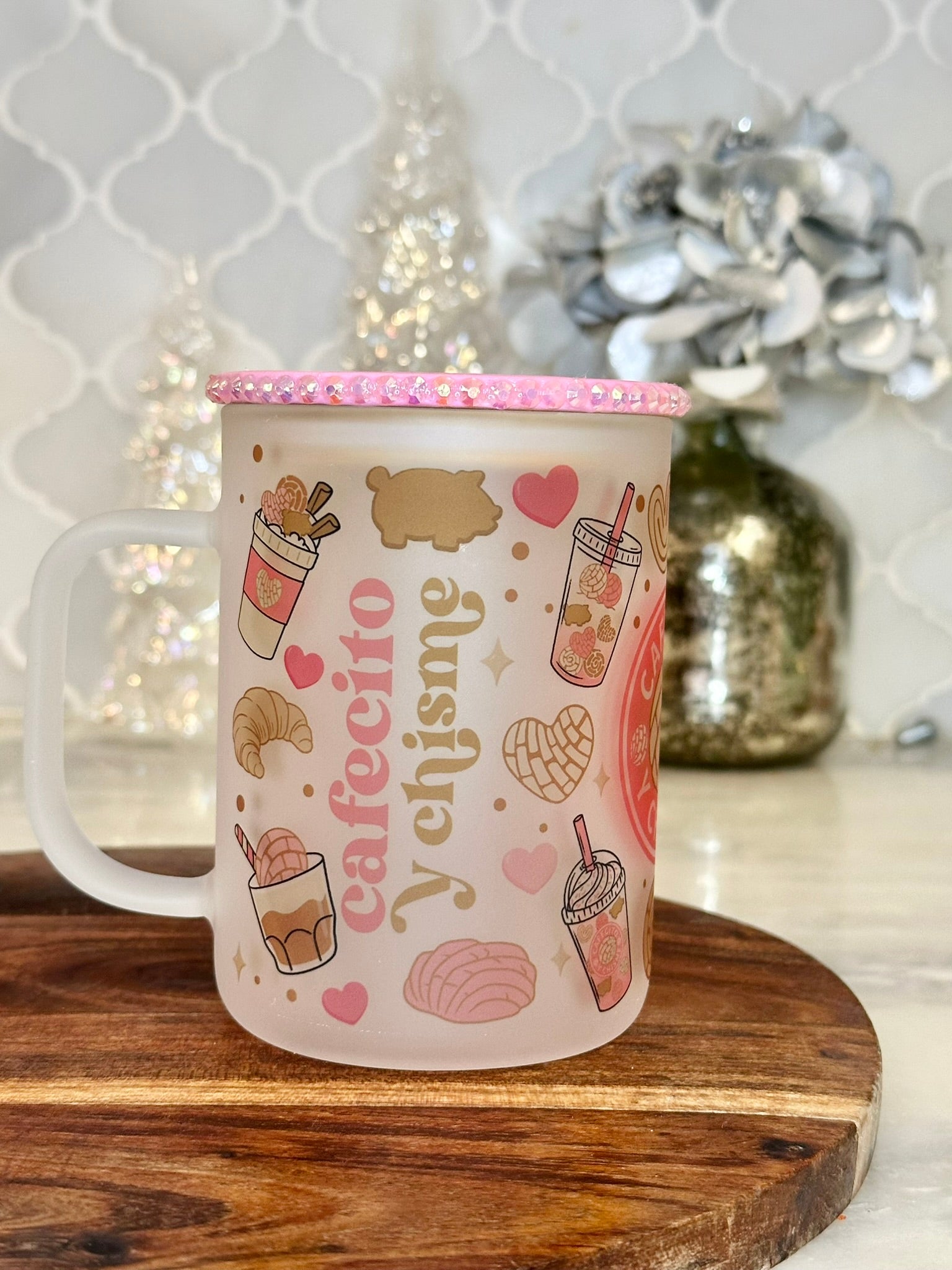 17oz frosted mug, cafecito y chisme, decal, pink rhinestones, plastic straw included